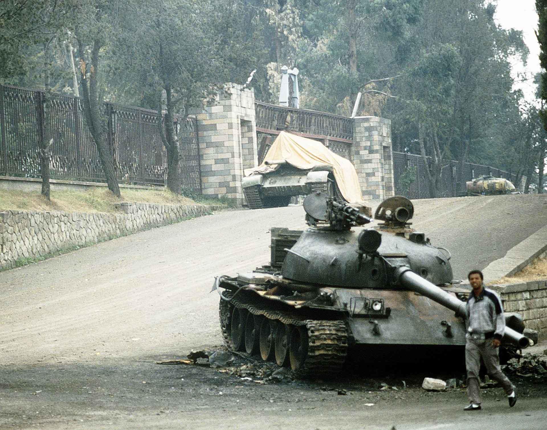 Lokala invånare går förbi en T-62 stridsvagn som är strandsatt utanför presidentpalatsen i Addis Abeba efter en strid mellan rebellstyrkor och regeringen. Foto: Wikimedia Commons