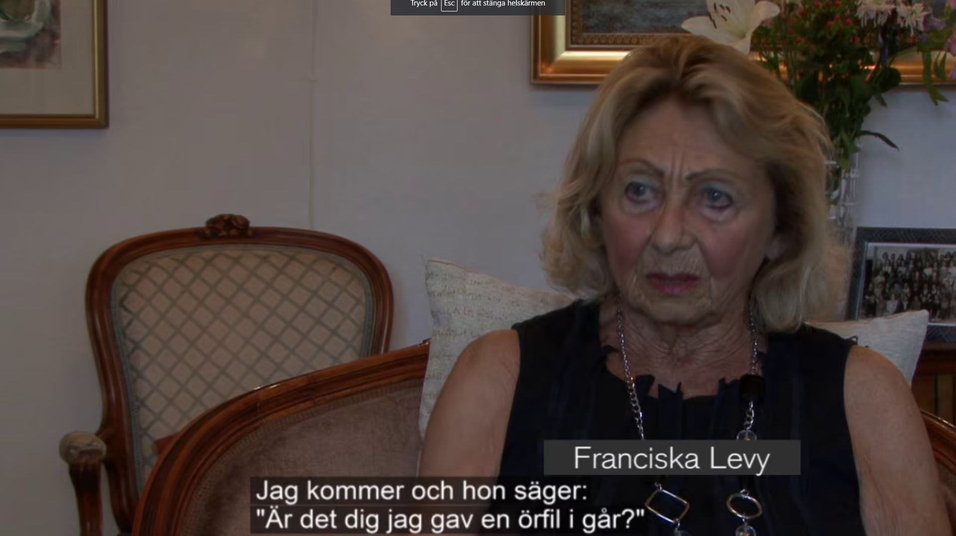 Franciska Levy (kallas Mimmi) föddes 1928 i en judisk familj i Tjeckien. Hon bodde i tjeckiskt ghetto och satt i flera koncentrationsläger bl. a. Bergen-Belsen och Auschwitz. Franciska kom till Sverige via Danmark 1945.